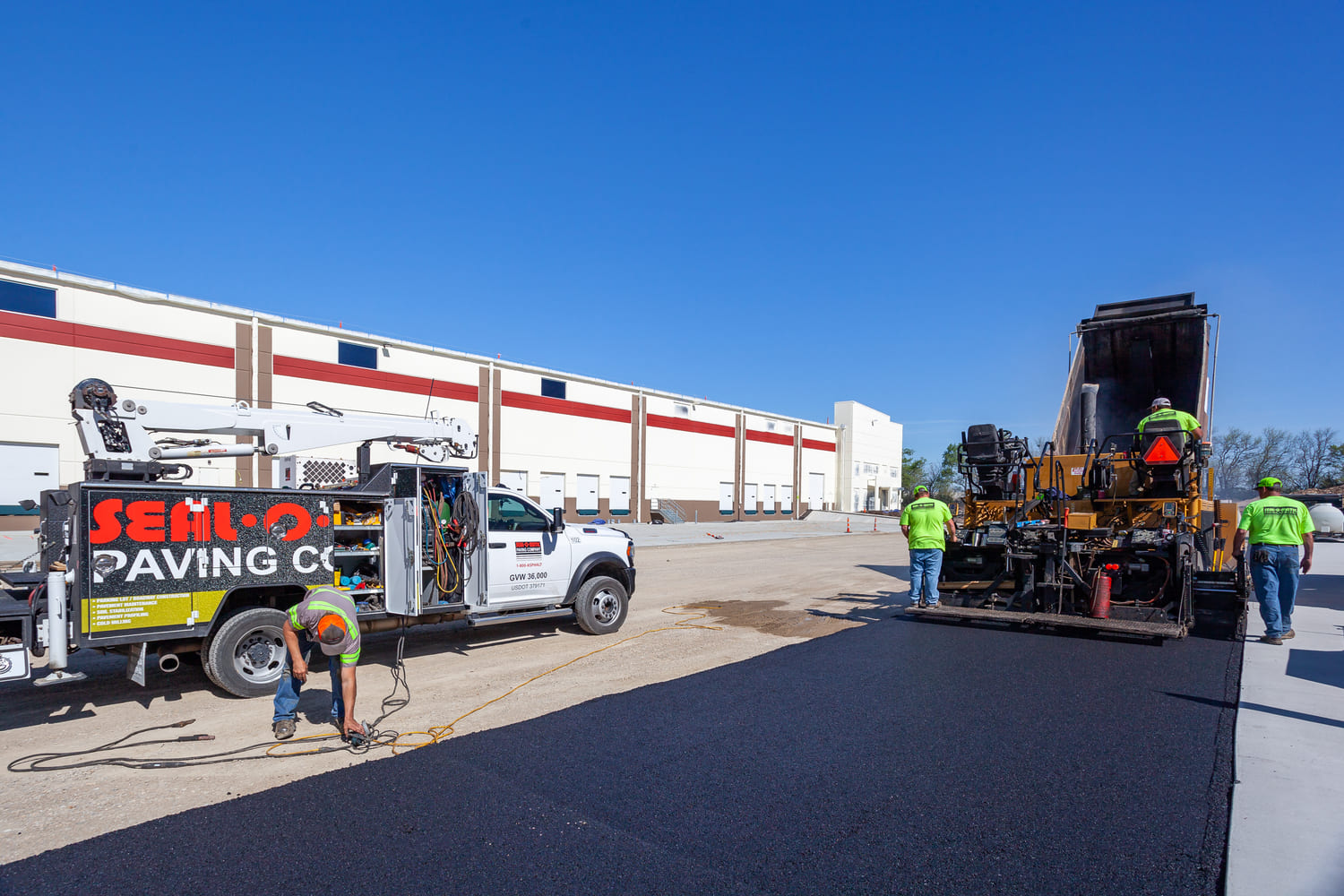 In four days, Seal-O-Matic was able to complete approx. 6,250 tons of 6-inch asphalt base and 2,180 tons of 2-inch asphalt surface. The project took 420 truckloads of asphalt. With Seal-O-Matic’s participation the General Contractor was able to meet their timeline with a great finished project for the owner.